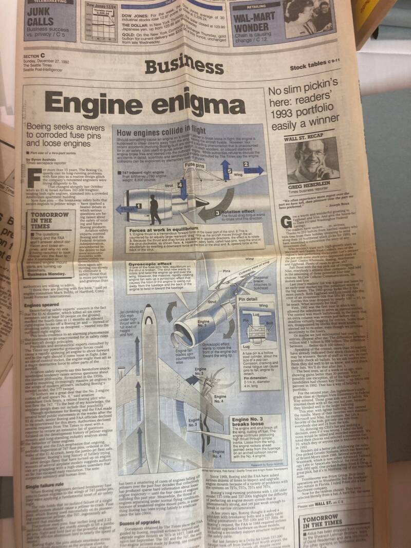 Het onderstaande artikel in de Seattle Times beschrijft zeer nauwkeurig wat er meer dan tien weken na het El Al-ongeval gaande is bij Boeing. Het is een uiterst zorgvuldig geschreven artikel. Het is duidelijk dat de resultaten door de Amerikaanse pers goed gevolgd werden, en zeker door de lokale media in Seattle. Het is ook duidelijk dat hier de relatie economie / veiligheid aan de orde is. Op 31 maart 1993 vond helaas nog een motorseparatie plaats bij Evergreen International Airlines in Anchorage Alaska.