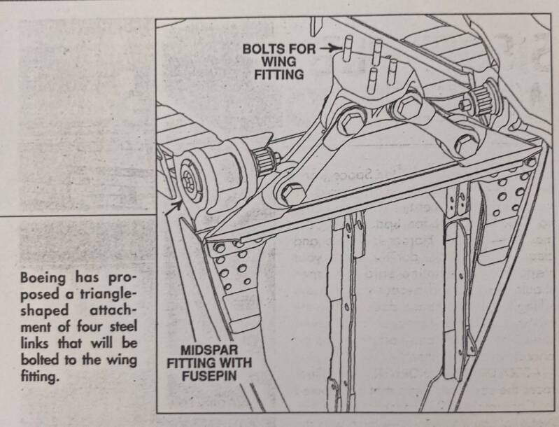 Links de oude situatie van de motorophanging (current mid-spar mountings) en de gemodificeerde ophanging (modified mid-spar mountings).