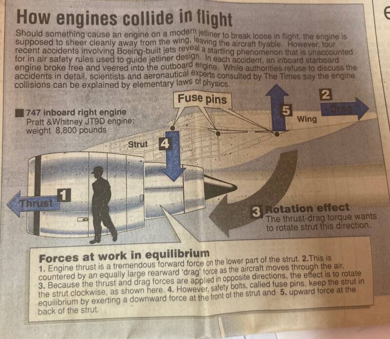 De high-bypass ratio motoren van de Boeing 747 (zowel de JT9D van Pratt & Whitney, de CF6-50 van General Electric en de Rolls Royce RB211 reageerden door grote gyroscopische krachten heftiger op een motorseparatie dan de low-bypass motoren van de Boeing 707. Beide afbeeldingen uit Amerikaanse kranten laten het mechanisme van het afbreken van de motoren 3 en 4 zoals bij El Al 1862 goed zien.