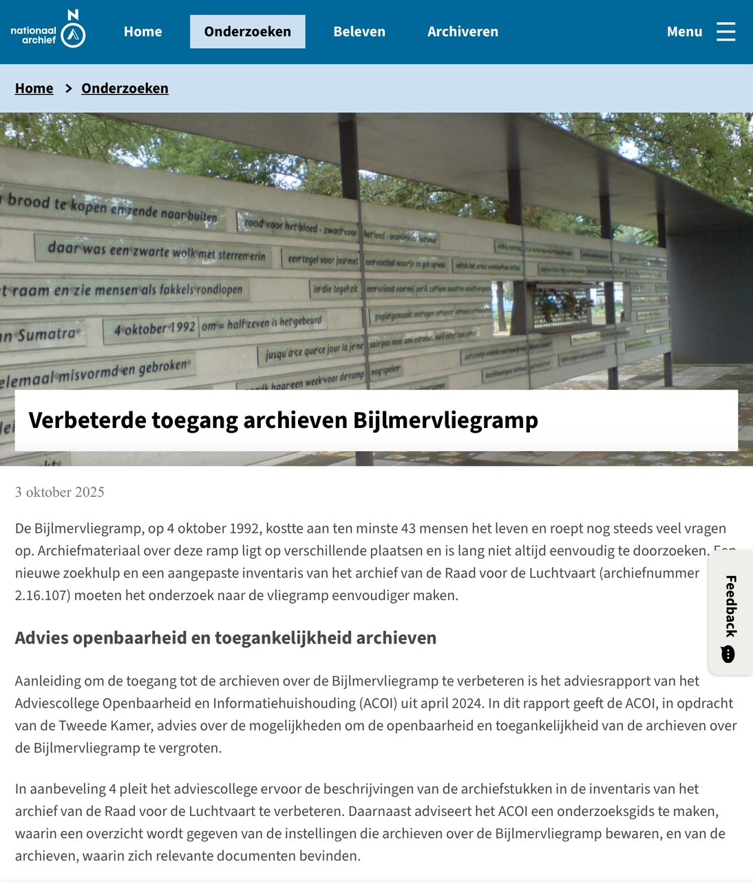 Op 4 juni bezocht ik een lezing van Vincent Dekker in dorpshuis De Schulp in Egmond-Binnen. Er was in lokale bladen aangekondigd dat er nieuwe inzichten over de vliegramp in de Bijlmermeer zouden worden gedeeld naar aanleiding van de vrijgegeven archieven van het Nationaal Archief in september en december 2024. Er werd echter niets nieuws verteld.