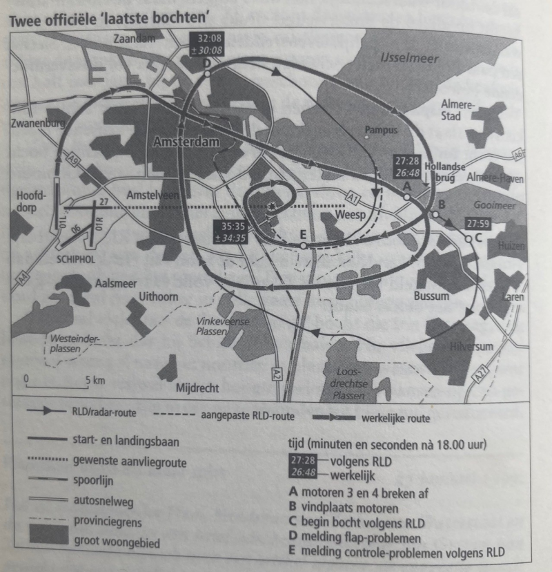 Boven: de route voorstelling uit het boek Going Down Going Down, van Vincent Dekker (1994 tot en met 2022), destijds journalist bij Trouw. De heer Dekker tekent de aan hem gegeven separatietijd van de motoren op 18:27:28 nabij de Hollandse Brug bij punt A, echter, deze tijd is afkomstig van de Digital Flight Data Recorder (DFDR). De tijd van dit opname-apparaat liep niet synchroon met de tijd die in de verkeerstoren werd geregistreerd. Het verschil bedroeg ongeveer tweeentwintig (22) seconden. Om de separatietijd goed in het plaatje hiernaast te kunnen weergeven, moet bij deze tijd tweeentwintig (22) seconden worden opgeteld om het beeld of het plaatje 'passend' te krijgen. Het separatie punt van de motoren komt dan te liggen op 18:27:28 + 22 seconden = 18:27:50 lokale tijd, zoals verder op wordt uitgewerkt en verduidelijkt. De motoren vallen er dus niet af bij de locatie A, zoals weergegeven in Dekker’s boeken, maar tussen de letters B en C ongeveer bij het driehoekje ten noorden van de stad Naarden. De onderzoekers hebben tot drie maal toe aan de heer Dekker proberen uit te leggen hoe zij hun berekeningen hadden gemaakt, maar dat kwam 'niet over', en de heer Dekker was niet overtuigd, omdat hij nogal wat informatie van ooggetuigen had verzameld, die een ander verhaal aan hem hadden gecommuniceerd. Het klopt inderdaad dat een aantal ooggetuigen ook heeft verwezen naar A als separatiemoment. Er waren echter ook ooggetuigen, onder andere politiemensen uit Almere, die getuigden van een andere locatie.