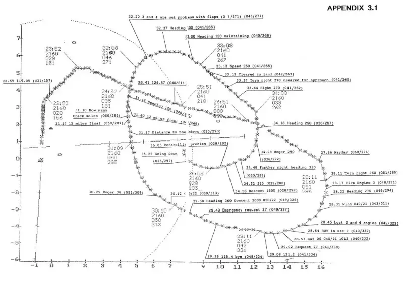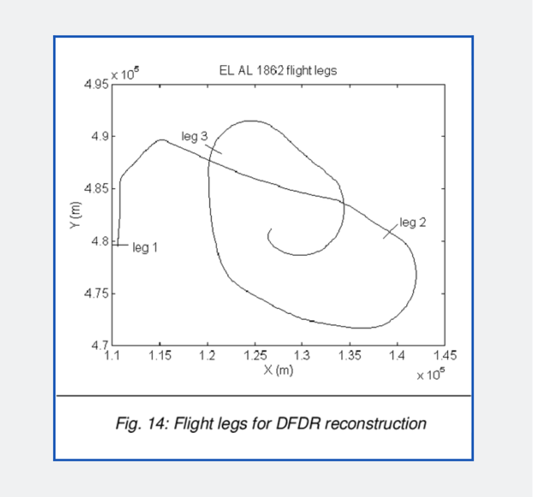 Hierboven een onafhankelijke reconstructie en vergelijking van de route van het vliegtuig uit de DFDR-gegevens met de uit de radar verkregen route over de grond. Deze reconstructie is gemaakt door de Technische Universiteit Delft met de originele DFDR-gegevens van het vliegtuig die bij het Nationaal Lucht- en Ruimtevaart Laboratorium waren opgeslagen (Bron: ir. M. H. Smaili en prof. dr. ir. J.A. Mulder). De reconstructie vond plaats na de publicatie van het eindrapport over het ongeval door de Raad voor de Luchtvaart in 1994. De koers en snelheid van de DFDR-data werden geïntegreerd tot een positie en gecorrigeerd voor de wind. De op die manier geconstrueerde DFDR-route en de radarroute blijken goed overeen te stemmen. Flight leg nummer 1 loopt vanaf de start van het vliegtuig tot aan de motorseparatie, en flight leg 2 loopt van de motor separatie tot het flaps up commando. Uit de reconstructies blijkt dat de FDRS gegevens redelijk tot goed met de ATC radar route overeenstemt.
