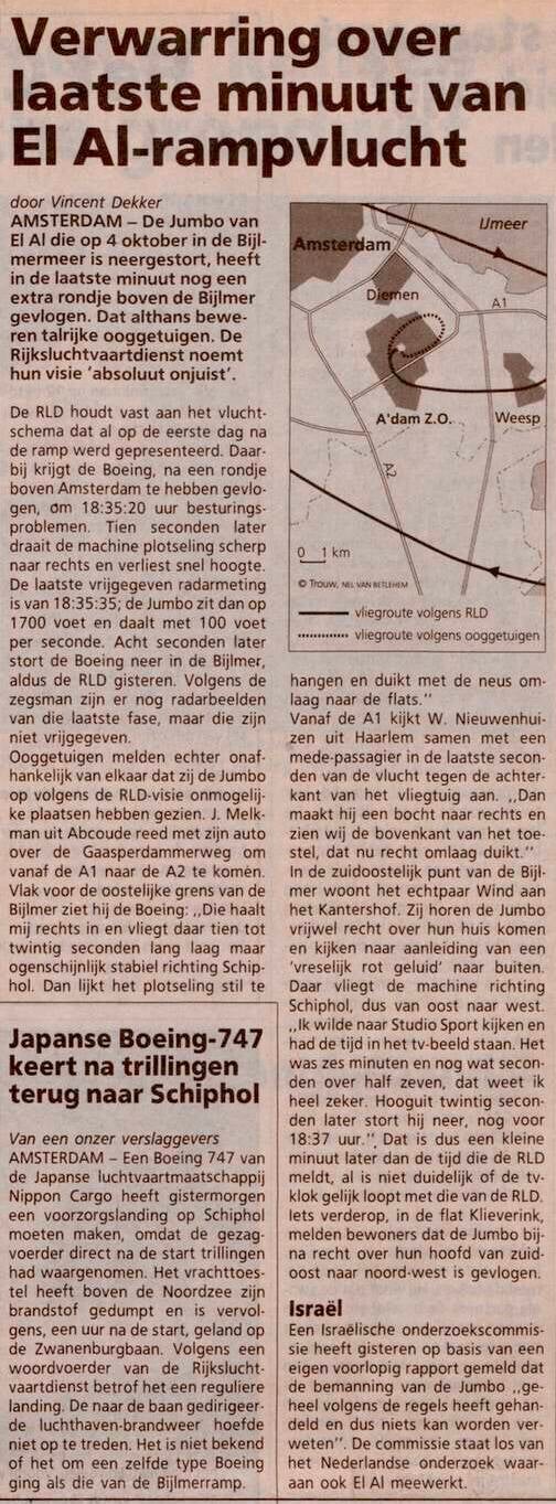 Op 29 oktober 1992 publiceerde Trouw, nauwelijks 25 dagen na het ongeval, dat op basis van ooggetuigenverklaringen geconcludeerd moest worden dat het neergestorte vliegtuig een extra rondje boven bebouwd gebied, de Bijlmermeer, had gevlogen. Het ICAO Annex 13 onderzoeksteam constateerde echter aan de hand van de reeds op 5 oktober afgegeven radar-plot en de inmiddels beschikbaar gekomen dfdr-data, dat dit extra rondje nooit gemaakt was. Men gaf de dfdr-data-analyse waaruit dat te concluderen was echter niet vrij, maar legde dat mondeling uit. Aangezien het bericht emotioneel belastend voor de slachtoffers zou kunnen zijn, en vragen opriep hoe een bemanning het in zijn hoofd had kunnen halen om met een vliegtuig boven een woonwijk grote risico‘s te nemen, liet de vooronderzoeker weten dat de voorstelling van zaken niet correct was. Door de internationale deelnemers aan het ongevallenonderzoek werd er bij de vooronderzoeker op aangedrongen dat hij zou laten weten dat de publicatie niet op de feiten beruste, en het bericht van Trouw verwarring creëerde die niet nodig en niet gewenst was. Ook de Israelische ambassadeur liet van zich horen, en bracht een bezoekje aan dagblad Trouw.