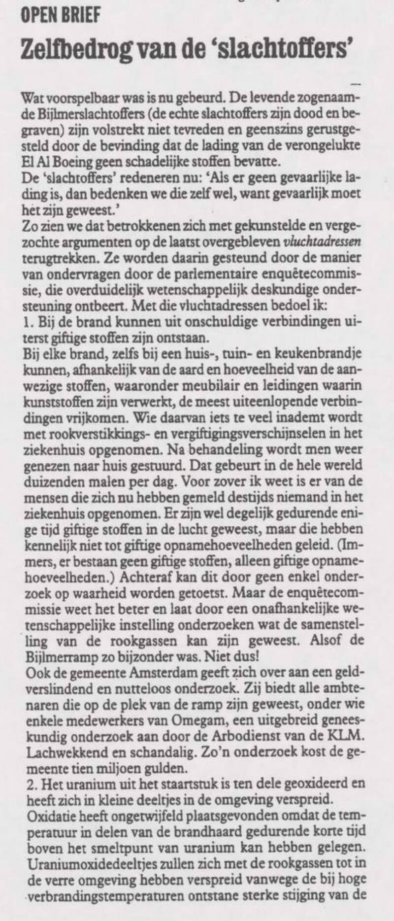 Hiermee onken ik niet dat er tussen 1993 en 2004 een serieus maatschappelijk probleem in de Bijlmermeer bestond. Maar niet alleen in de Bijlmermeer. Ook in politiek Den Haag en ook in de relatie journalistiek en politiek. Bijlmerbewoners begonnen – mede door verontrustende berichtgeving en voortdurende parlementaire vragen – in toenemende mate een verband te leggen tussen hun welbevinden en de vliegramp, vooral rond mogelijk giftige stoffen.