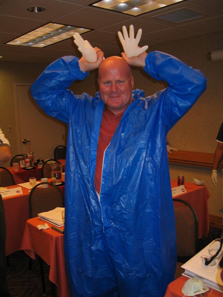 In zijn algemeenheid kan gesteld worden dat het zeer onprofessioneel van een vliegtuigongevallenonderzoeker of ander ingezet personeel bij een luchtvaartramp is, om een crashlocatie te betreden zonder goede bescherming. Meestal zal men geen toegang krijgen. Hieronder ziet u een aantal foto's van mijn training in Albuquerque in New Mexico. We gebruikten daar blauwe in plaats van witte pakken. De training werd door de meeste cursisten als iets bijzonders beschouwd, zelfs soms een beetje hilarisch getuige een van de foto's.