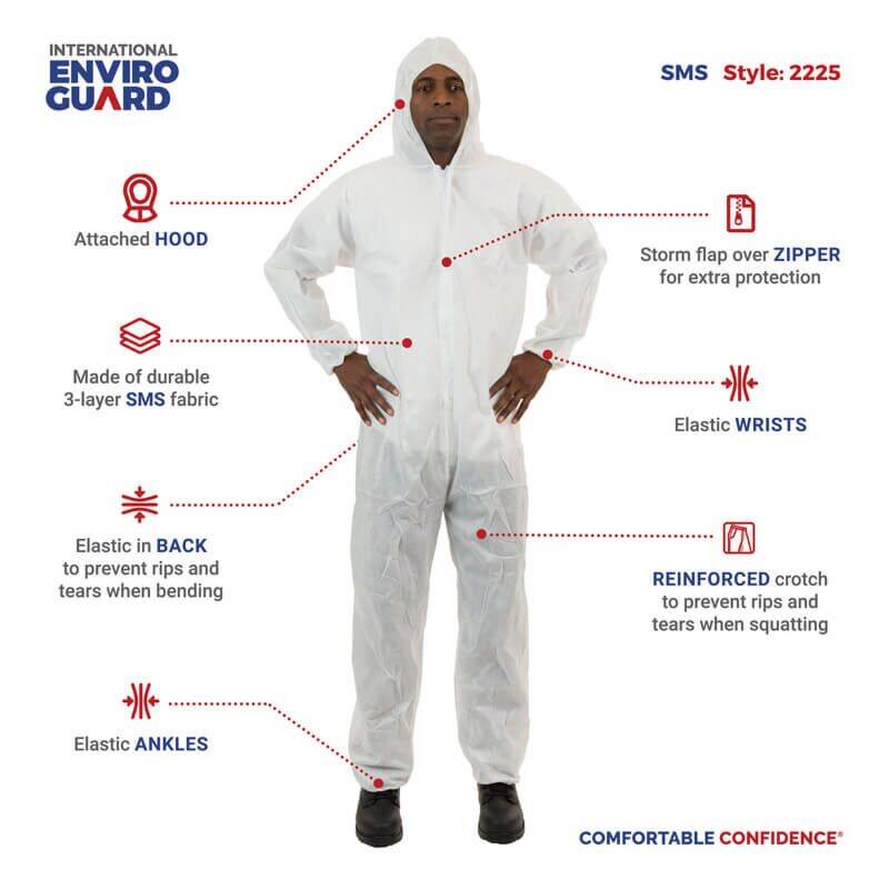 Bij het beschermen tegen besmetting speelt kleding een belangrijke rol. Er worden overalls gebruikt, wit of blauw van kleur, handschoenen, voetbescherming, maskers, mondbescherming en brillen. Men wordt erop getraind de kleding op een verantwoorde manier na gedane werkzaamheden uit te trekken en weg te doen. Hieronder een aantal foto's van de kleding.